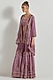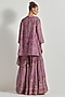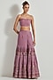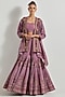 Featuring a lavender jacket in velvet base. It is paired with a bustier and pleated sharara pants. Accentuate it with statement earrings and heels for a festive look.