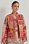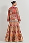 Featuring a multi-colored skirt in jacquard tissue base with patchwork embroidery. It is paired with a taffeta jacket and a velvet patchwork embroidered bustier. Accentuate it with statement earrings and block heels for sangeet ceremonies.