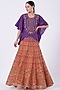 Featuring a sapphire purple short top in crushed silk base with hand embroidery. It is paired with a contrasting rust orange organza skirt having cross-stitch embroidery.