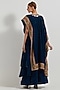 Featuring a teal asymmetric cape in velvet base with hand embroidery. It is paired with a slip and a tiered skirt. Accentuate it with statement earrings and heels for a festive occasion.
