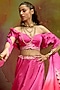 Featuring a red and pink lehenga in modal satin and shantoon base with banarasi zari applique work. It is paired with a ruffled blouse and a dupatta. Accentuate it with jewellery, embellished heels and a potli bag for festive occasions or wedding ceremony.