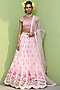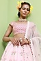 Featuring a blush pink lehenga in dola silk and raw silk base with fuchsia print. It is paired with a matching blouse having sadhi buds work and a net dupatta.