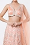 Featuring a peach lehenga in organza base with gota and thread work. It is paired with a matching blouse and a net dupatta.