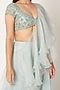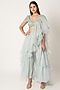 Featuring a sky blue pleated pant saree in organza and chanderi silk base. It is paired with a matching blouse having embellishments and cape sleeves.