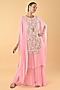 Featuring a baby pink tunic in georgette base with kaftan sleeves, pearl and mirror embellishments. It is paired with palazzo pants. Accentuate it with statement earrings, a sleek braid, and block heels, ideal for pre-wedding ceremonies.