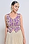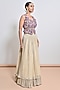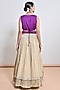 Featuring a gold gathered skirt in crush chiffon zari and net base. It is paired with a purple zardosi embroidered silk organza peplum top and a hand embroidered belt. Accentuate it with statement earrings, a sleek braid, and metallic heels, ideal for sangeet ceremonies or weddings.