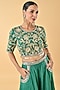 Featuring a green padded blouse in silk organza base with open back, zari and gota embroidery. It is paired with flared palazzo pants having pockets. Accentuate it with zircon earrings and heels for a festive occasion, mehendi, intimate pooja or sangeet ceremony.