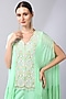 Featuring a mint green tiered tunic in georgette base with sequins and pearl embroidery. It is paired with flared organza silk palazzo pants. Perfect for a mehendi or festive occasion.