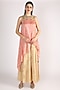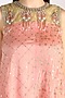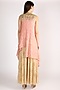 Featuring a peach asymmetrical layered tunic in georgette base with gold aari embroidery on the yoke. It is paired with contrasting paneled palazzo pants.