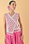Featuring a pink overlap blouse in chiffon crepe base with bandhani print, mirror and bead embroidery. It is paired with bandhani printed flared palazzo pants. Accentuate it with zircon earrings and heels for a festive occasion, a cocktail party or sangeet ceremony.