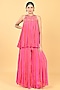 Featuring a pink and red tunic in chiffon crepe base with glass beads cutwork embroidery. It is paired with flared palazzo pants. Accentuate it with statement kundan earrings and embellished heels for a stylish ensemble, ideal for sangeet celebrations, wedding festivities or festive evening gatherings.