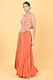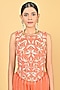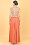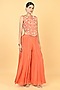 Featuring a rust orange peplum in chiffon crepe base with glass beads cutwork embroidery. It is paired with embroidered palazzo pants. Accentuate it with statement kundan earrings and embellished heels for a stylish ensemble, ideal for sangeet celebrations, wedding festivities or festive evening gatherings.