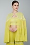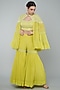 Featuring a yellow cape in georgette base with leaf sequins embroidery. It is paired with matching chiffon crepe blouse and embroidered gharara pants.