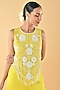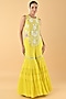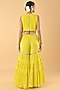 Featuring a yellow blouse in chiffon crepe base with floral motifs and bead embellishment. It is paired with tiered gharara pants. Accentuate it with dangler earrings and flats for a festive occasion, sangeet, haldi or wedding ceremony.