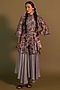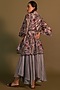 Featuring a grey mid-length shirt dress in chanderi base with bell sleeves, lace detailing and floral print. It is paired with matching silk flared pants, an inner and a belt.