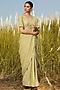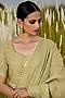 Featuring a mint green saree in handcrafted cotton base with gold foil detailing. It is paired with a matching stitched blouse having gota detailing.