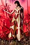 Featuring a scarlet and beige maxi dress in mul cotton base with noodle straps and shibori dyeing.