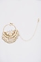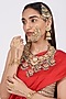 Featuring a gold finish bridal necklace studded with kundan polki, set in mixed metal. It is paired with a matching pair of earrings, nath, maang tikka, and a pair of bracelets.