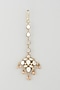 Featuring a pair of gold finish jhumka earrings studded with light orange stone, kundan polki and pearls, set in mixed metal. It is paired with a matching mangtikka.