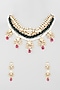 Featuring a gold finish necklace studded with multi-colored beads, pearls, and kundan polki, set in mixed metal. It is paired with a matching pair of earrings.
