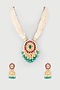 Featuring a gold finish mala studded with multi colored stones, pearls, and kundan polki, set in mixed metal. It is paired with a matching pair of earrings.