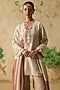 Featuring a beige and pink short kurta in silk base with bell sleeves, round neckline and beaded embellishments. It is paired with striped pants having an elasticated waistband and a dupatta. Style it with polki stud earrings and wedges for festive occasions, sangeet or cultural celebrations.