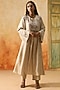 Featuring a beige long kurta in silk base with bell sleeves and round neckline, including bandhani print, beads and floral motif embroidery. It is paired with printed pants. Style it with polki stud earrings and wedges for festive occasion, sangeet or cultural celebrations.
