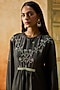 Featuring a charcoal grey long kurta in silk base with bell sleeves and round neckline, including bandhani print, beads and floral motif embroidery. It is paired with printed pants. Style it with polki stud earrings and wedges for festive occasion, sangeet or cultural celebrations.