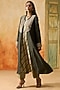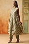 Featuring a beige and green sleeveless striped tunic in silk base. It is paired with straight-fit pants and a charcoal grey jacket having beads embellishments. Style it with silver stud earrings and wedges for festive occasion, sangeet or cultural celebrations.