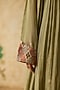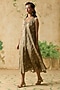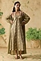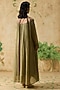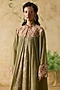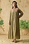 Featuring a green flowy sheer jacket in silk base with bandani and ikkat patch work. It is paired with a V-neck dress having autumn print. Style it with silver stud earrings and wedges for festive occasion, sangeet or cultural celebrations.