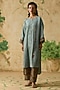 Featuring a teal high-low kurta in silk base with a side slit, back pleats, beads embroidery and ikkat detailig. It is paired with a straight pants. Style it with silver stud earrings and wedges for festive occasion, sangeet or cultural celebrations.