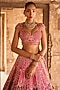 Featuring a deep pink lehenga in linen satin base with patchwork, floral, motifs, glass beads, pearl and zardosi embroidery. It is paired with a blouse and a silk organza embroidered dupatta. Accentuate the designer lehenga with statement jewellery and heels for a bridal look.