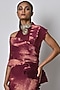 Featuring a maroon metallic dress in pleated polyester base with hand embroidery. It is paired with a matching pleated drape.