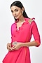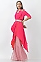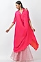 Featuring a fuchsia wrap in pleated polyester mix base with bird detailing. It is paired with contrasting pink mirror embroidered sharara pants and a hexagon embroidered belt.