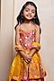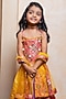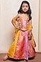 Featuring a multi-colored lehenga for girls in brocade silk and net base with embroidery and an elasticated waistband at the back. It is paired with a strappy top and a yellow dupatta. Style it with sandals and hair accessories for festive occasions.