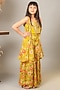 Featuring a multi-colored cape for girls in crepe and crepe chiffon base with print, sequins and thread embroidery. It is paired with a top and palazzo pants. Style it with sandals and hair accessories for festive occasions or sangeet ceremony.