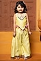 Featuring a yellow sleeveless top for girls in pure chanderi silk base with thread, sequins, pearl, stone and bead embroidery. It is paired with palazzo pants having an elasticated waistband at the back. Accentuate it with matching hair accessories and sandals for a stylish ensemble, ideal for any festive occasion.