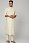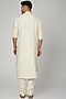 Featuring a off white kurta in matka silk base with yellow open styling for the front. It is paired with matching churidar pants.
