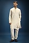 Featuring an ivory kurta in cotton base with satin weave detailing and twig hand embroidery. Style it with pants, kolhapuri sandals for a festive gathering and intimate pooja ceremony.