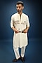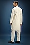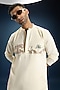 Featuring an ivory kurta in cotton base with satin weave detailing and jungle hand embroidery. Style it with pants, kolhapuri sandals for a festive gathering and intimate pooja ceremony.