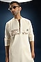 Featuring an ivory kurta in cotton base with satin weave detailing and jungle hand embroidery. It is paired with pants. Style it with kolhapuri sandals for a festive gathering and intimate pooja ceremony.