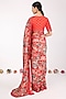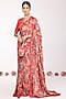 Featuring a red saree in silk base with floral print. It is paired with a matching hand embroidered unstitched blouse.