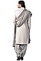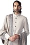 Featuring a light grey sherwani in blended wool base with pearl buttons. It is paired with contrasting silver grey cotton silk draped patiala cowl pants, and a grey silk stole having mughal zardosi embroidered motifs.