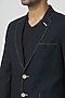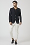 Featuring a navy blue sports blazer in wool and cupro base with white running stitch detailing on lapel and the body. It is paired with contrasting white cotton trousers.