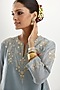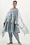 Featuring a blue short kalidar kurta in silk chanderi base with gota flowers, gota lace, and zari embroidery. It is paired with matching cotton narrow salwar pants and an organza dupatta.