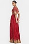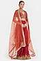 Featuring a bright red choli in silk chanderi base with a deep v-neckline, side zip, gota piping detail, dori, sequins and bead embroidery. It is paired with a forty kali lehenga having gota embroidery, including an orange silk organza dupatta. Style it with statement jewellery and heels for a sangeet, wedding or engagement ceremony.
