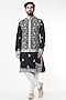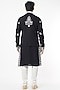 Featuring a black bundi jacket in rayon base with daman machine work. It is paired with a matching kurta having bootas and churidar pants.