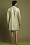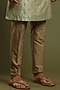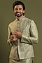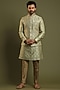 Featuring an olive green kurta in blended silk and raw silk base with a mandarin collar and zari thread embroidery. It is paired with contrasting churidar pants and a bundi jacket having floral embroidery.