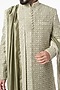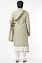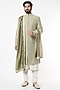 Featuring an olive green sherwani in lucknowi and vishika silk base with embroidery. It is paired with a contrasting lucknowi kurta, churidar pants, and a stole.