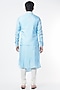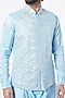 Featuring a sky blue bundi jacket in mysore silk base with mirror embroidery. It is paired with a matching cowl kurta and churidar pants. Perfect for a wedding, engagement or sangeet ceremony.